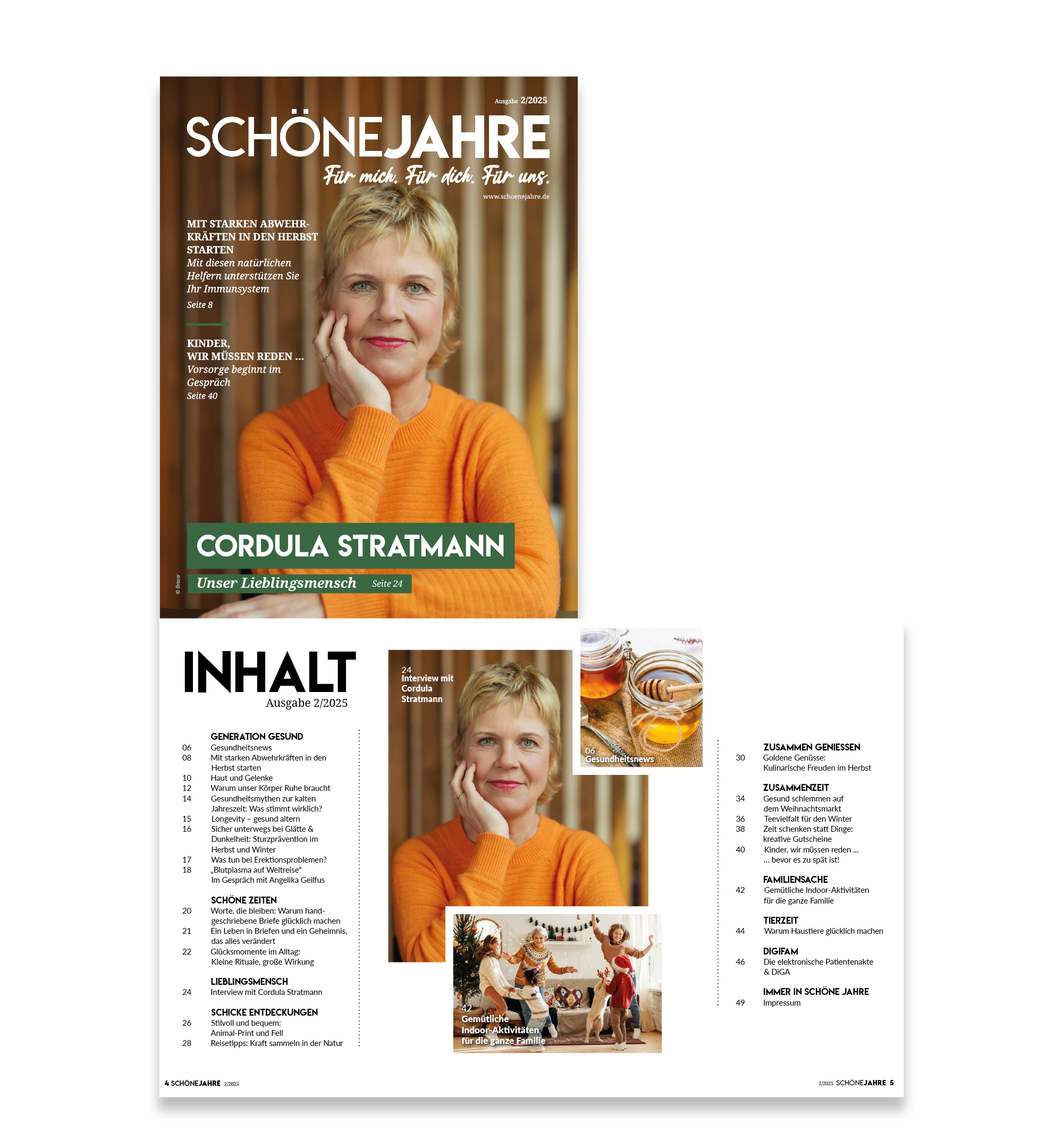Das beliebte Magazin „SCHÖNE JAHRE – Für mich. Für dich. Für uns.“ bedient vielfältige Themenbereiche für die Leserschaft im besten Alter – von Familie und Gesundheit, über Neues aus der digitalen Welt bis hin zu Kochen und Genießen.