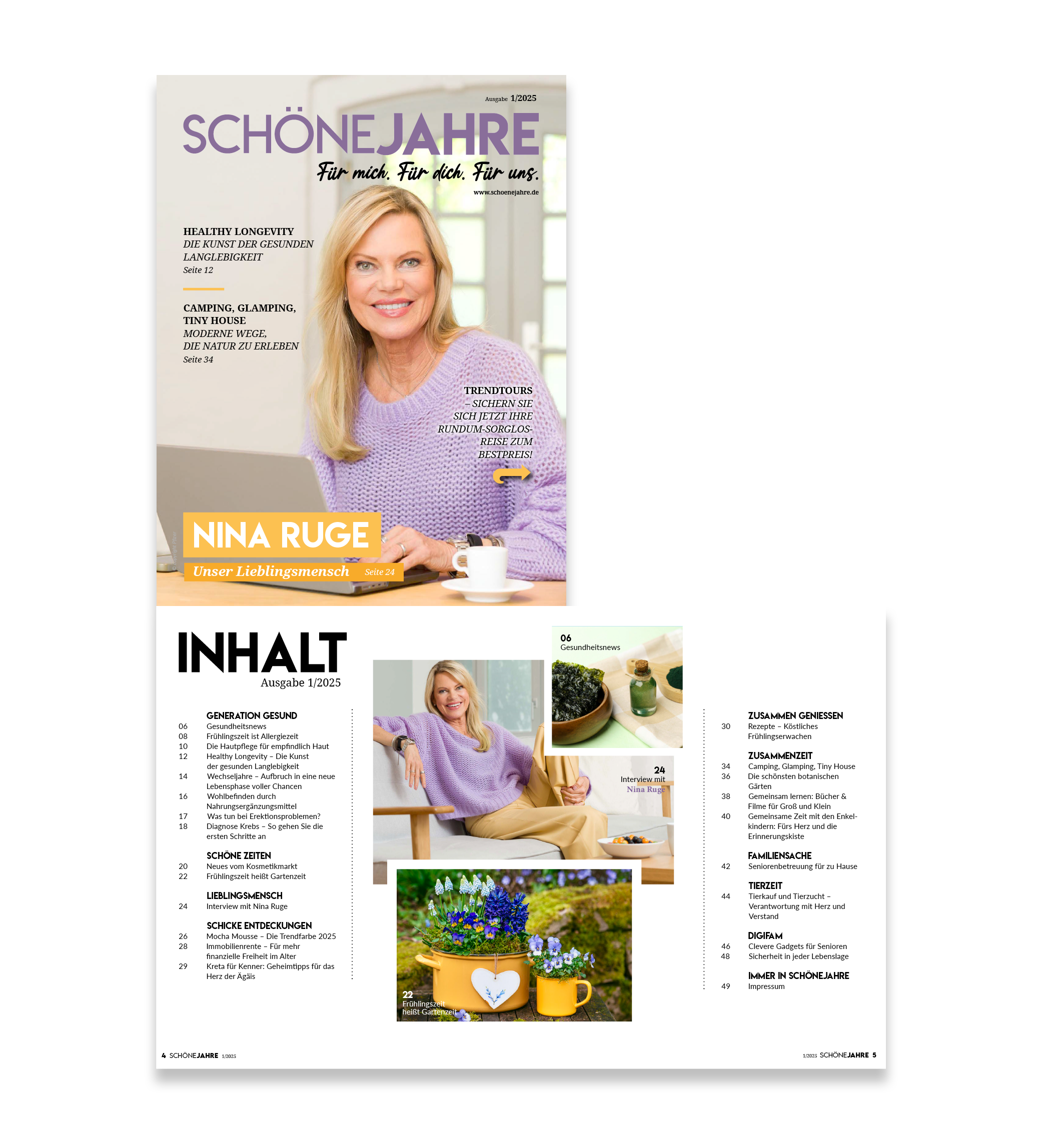 Für mich. Für dich. Für uns.Print-Werbung besticht durch Glaubwürdigkeit und ist für unsere Zielgruppe sehr relevant. Perfekt, um Kunden auf Ihr Produkt aufmerksam zu machen. „SCHÖNE JAHRE – Für mich. Für dich. Für uns.“ wird über die Glückstüte® distribuiert. Diese ist ein hoher Multiplikator mit zielgenauer Ansprache, denn mit der Glückstüte® wird das Magazin ganz persönlich an interessierte Menschen der Zielgruppe 45plus übergeben.